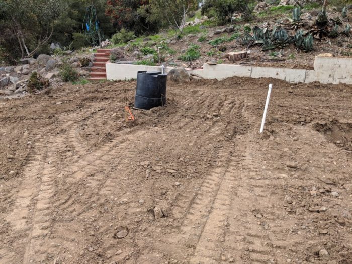 On Tuesday, the original demo people came back with a bobcat to remove the rocks from the edges of the house pad. They got all the ones from the west side, which is unreachable except by crossing the pad. They will return after the rain to remove the remaining ones on the east side and by the garage.