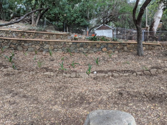 In the meantime, on Saturday, Ted and Pete started outlining some areas in the front yard with rocks. On Monday, Pete left for New Mexico for a month or so. On Tuesday Ted did some more outlining. The plants behind the outline in this first picture are star amaryllises. Unfortunately, none of them are blooming in the picture. They and the blooming clivias up on the terrace behind them were given to us from friends at church, Paul and Tom. The amaryllises are already spreading. The building in the background is our neighbor’s chicken coop.